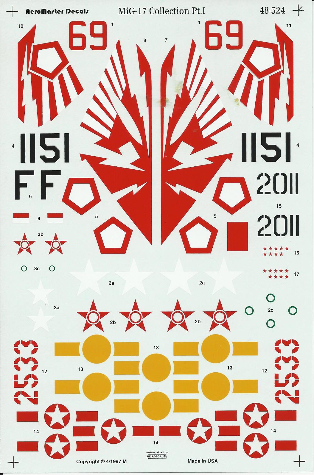 This is one of Aeromaster's Mig-17 decals. The decals are bueatifully printed and include enough decals to make all four included schemes.