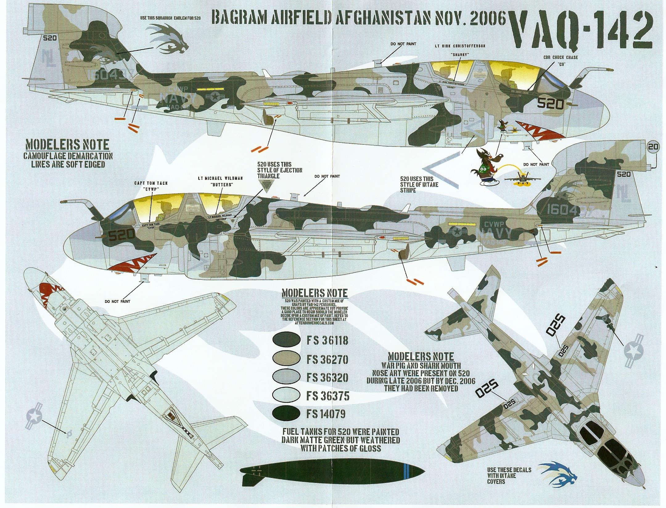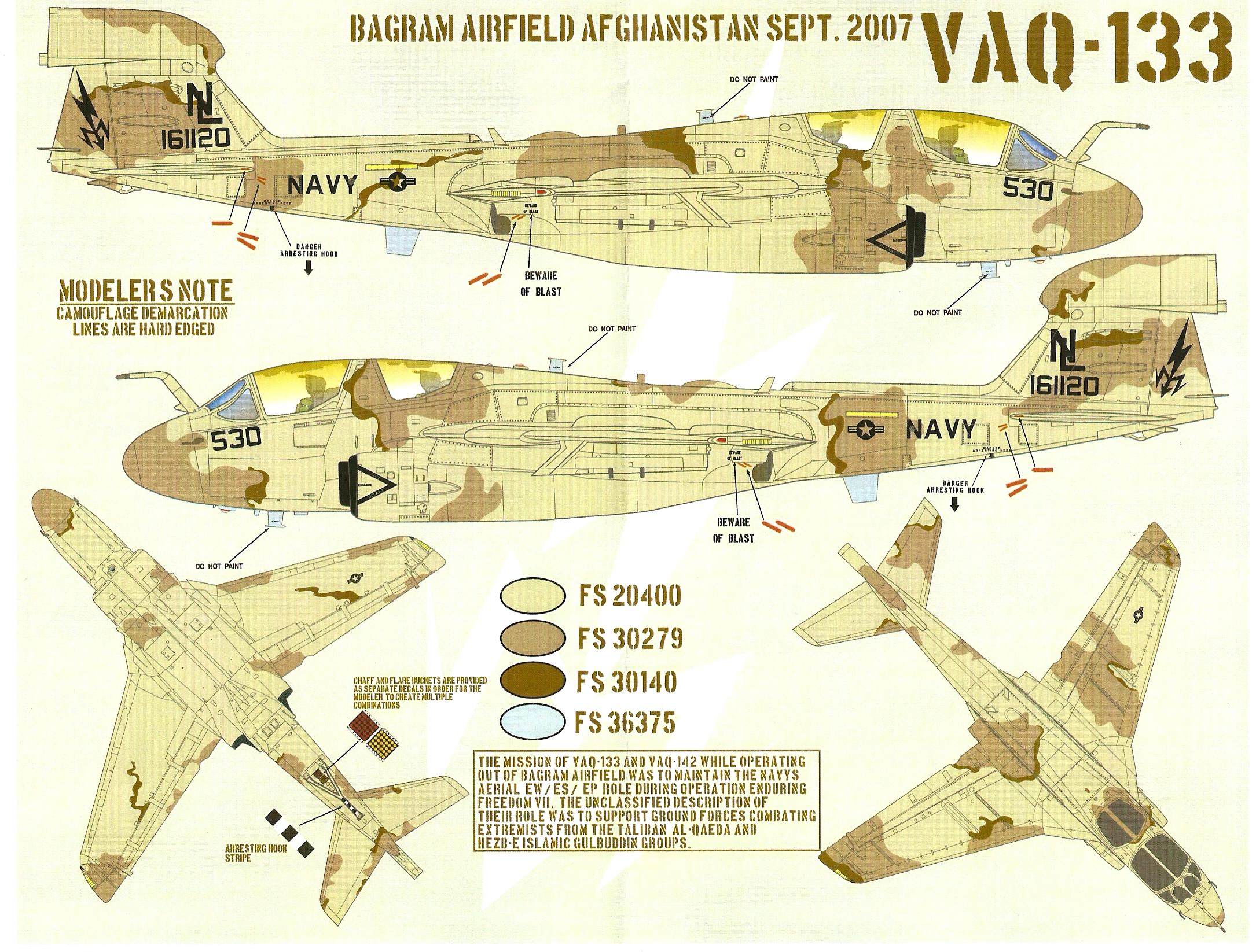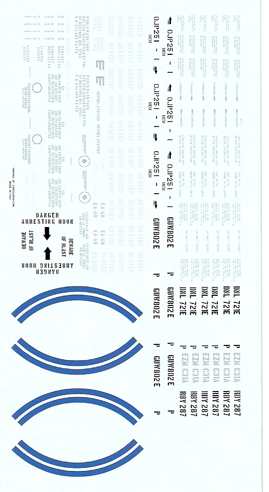 This is one of the most interesting EA-6B decal sheets I have seen. Included are markings for five different aircraft including two very unique camo schemes