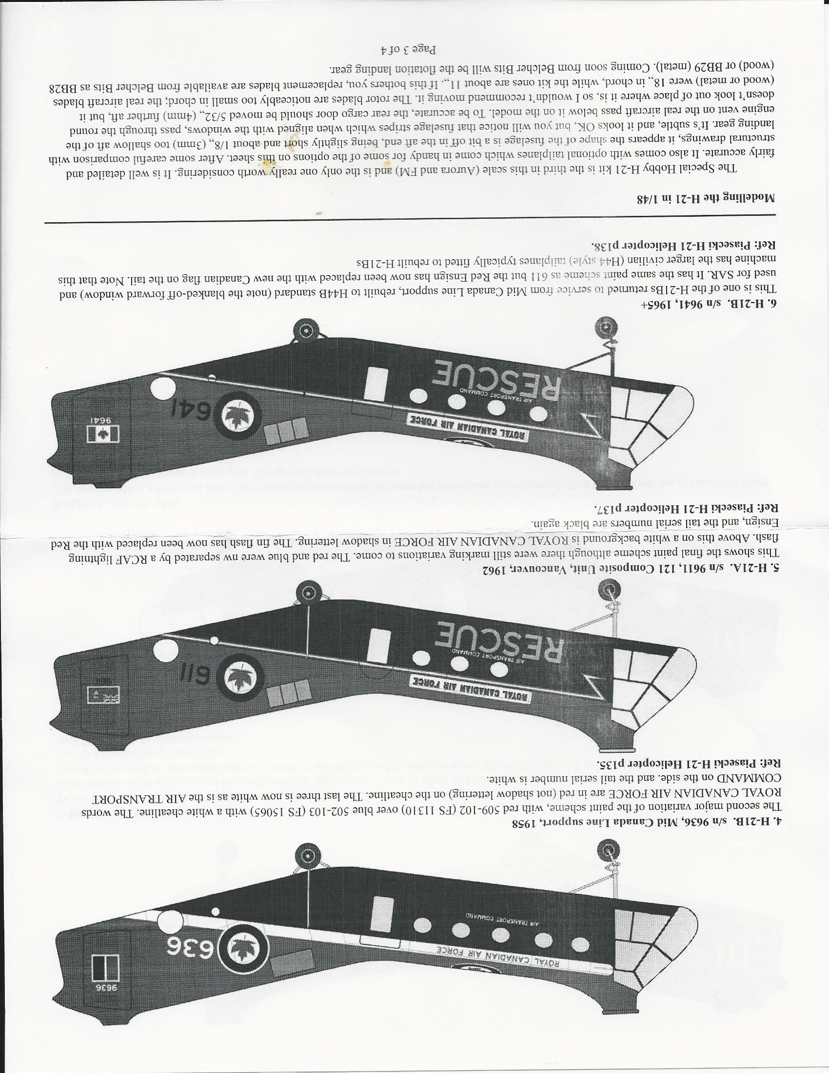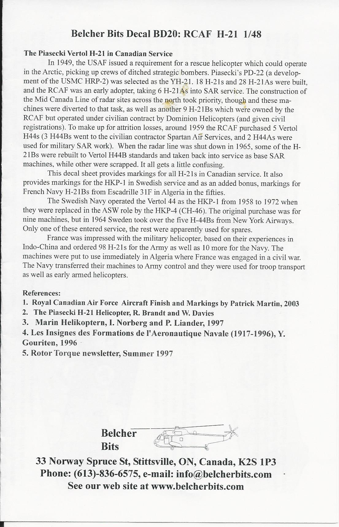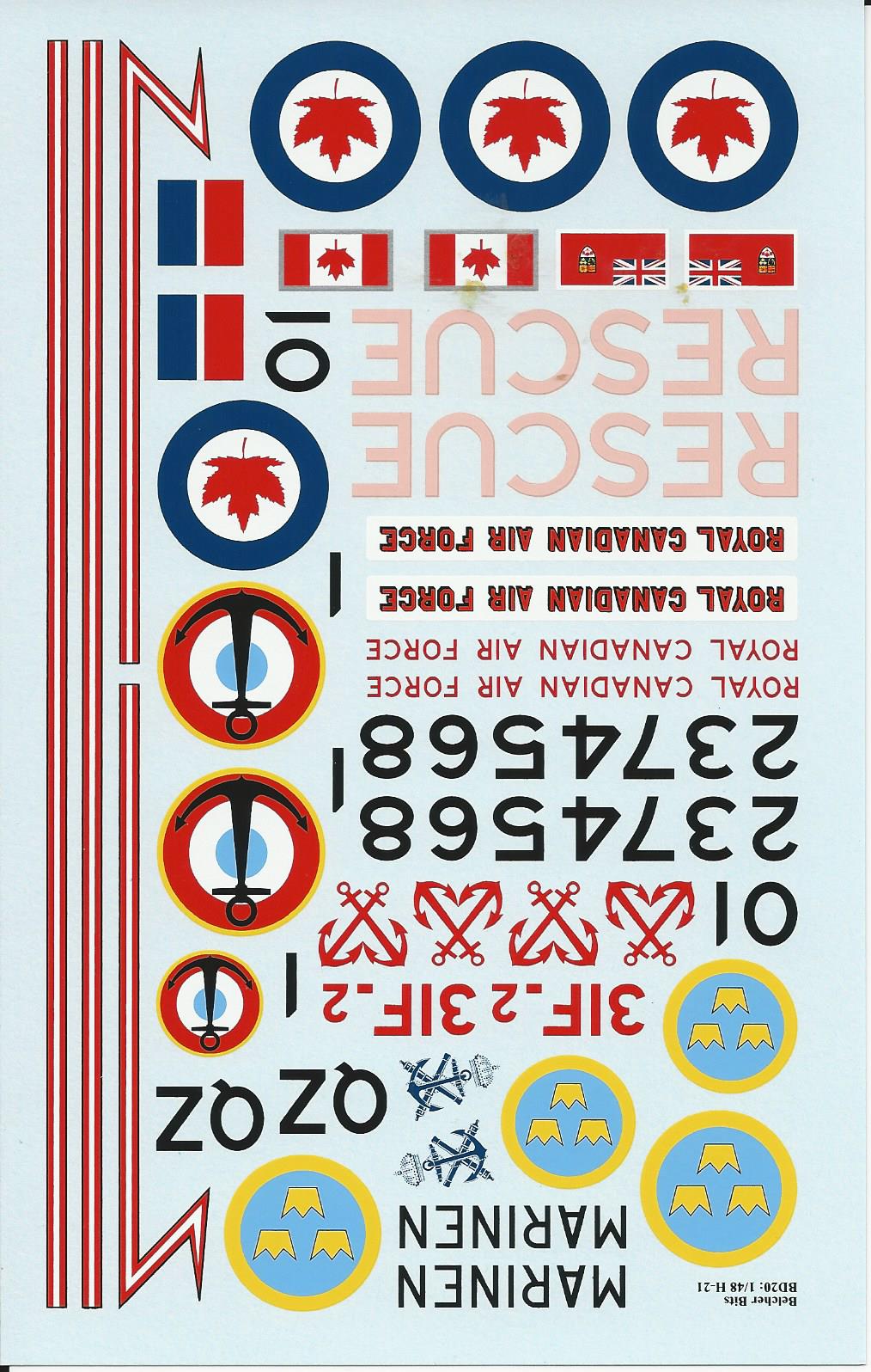 This is a very comprehensive decals set for the 1/48 H-21. It includes decals for RCAF, French Navy and Swedish Navy.. There are enough markings to make