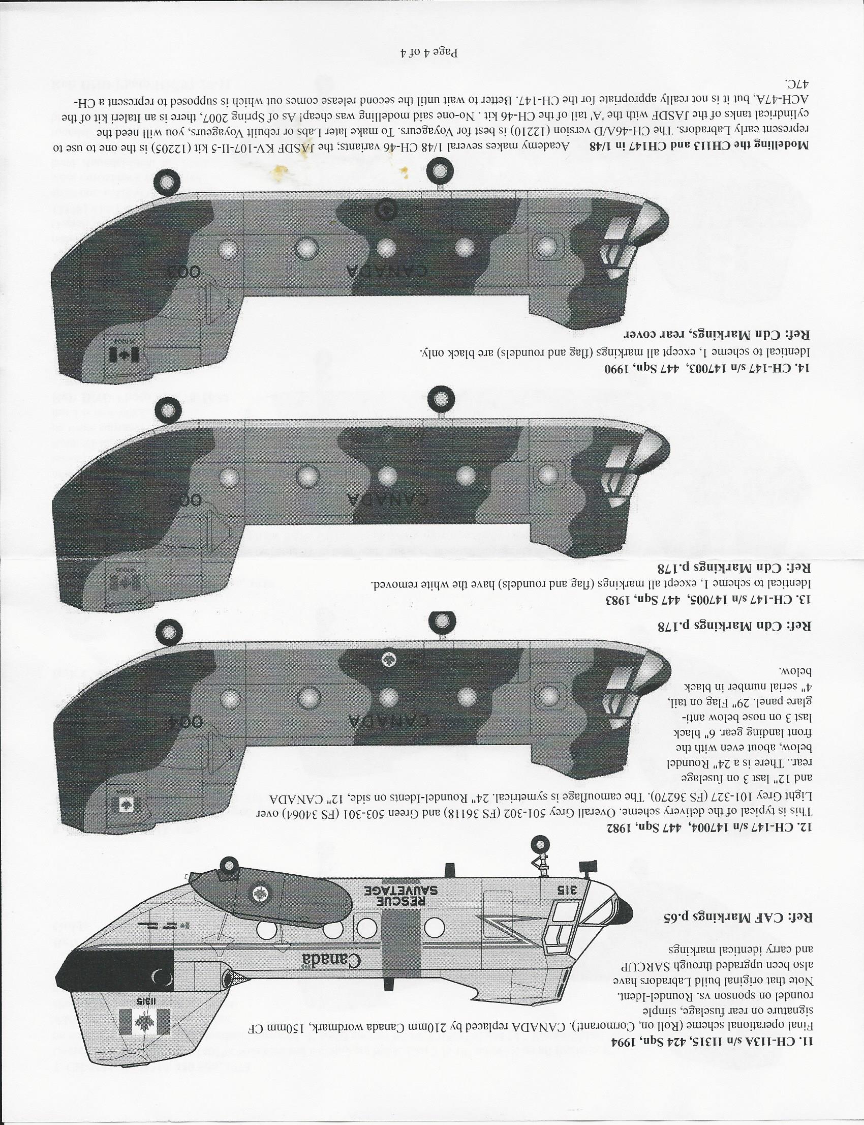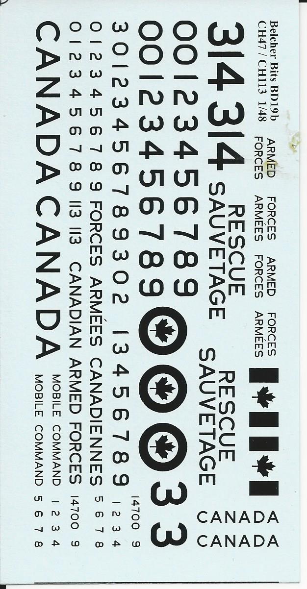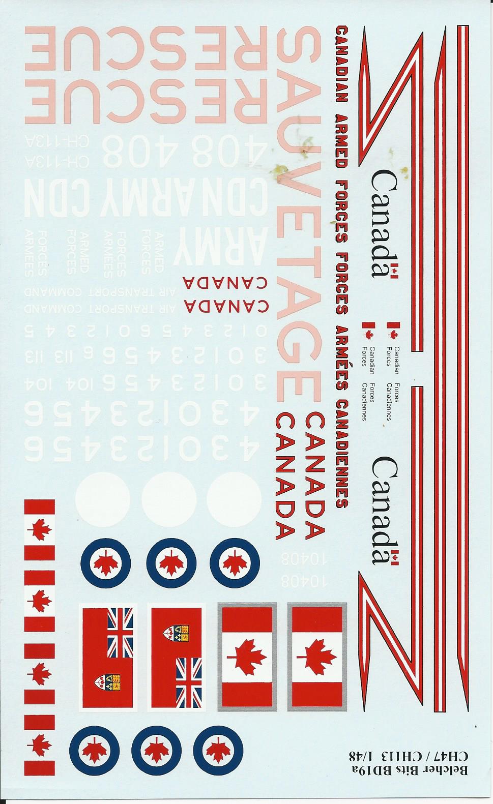 This is a very comprehensive decals set for the 1/48 labrador/Voyageur and Chinook. It includes decals for RCAF, and CDN Army. There are enough markings to make