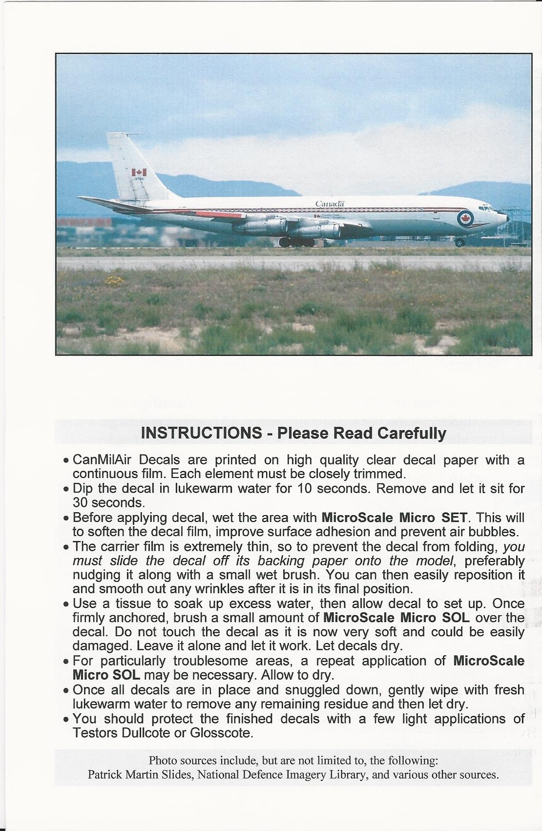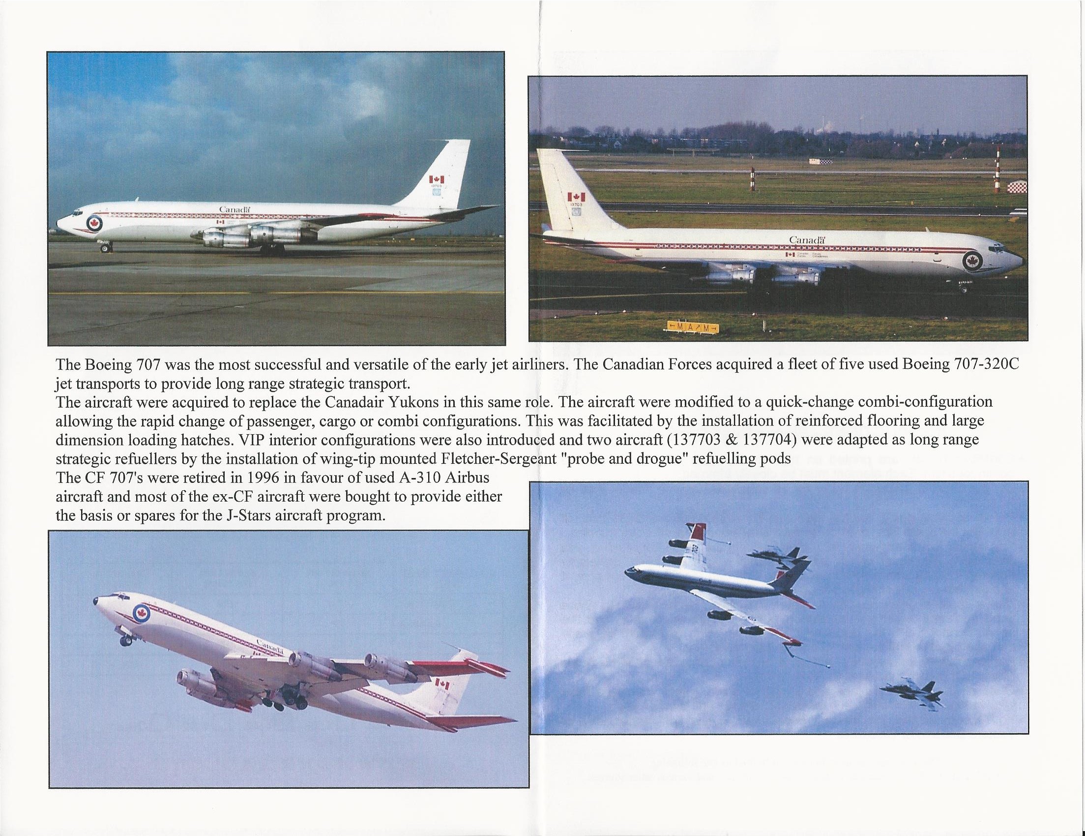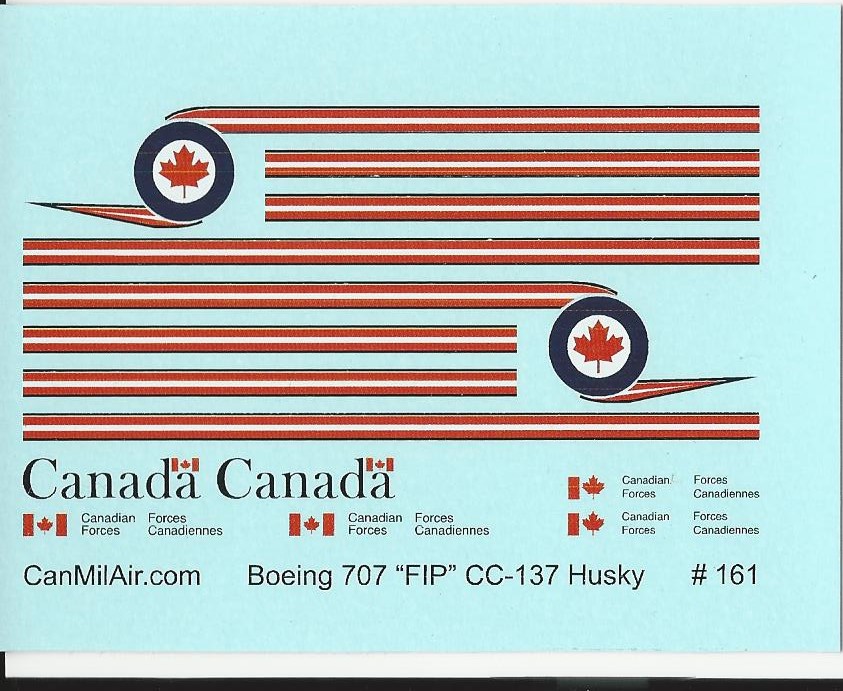 This sheet includes the basic markings for Boeing 707's in Canadian Service while it wore the FIP scheme. It has all the fuselage stripe, upper fuselage titles and the Canadian Forces title block in two formats.