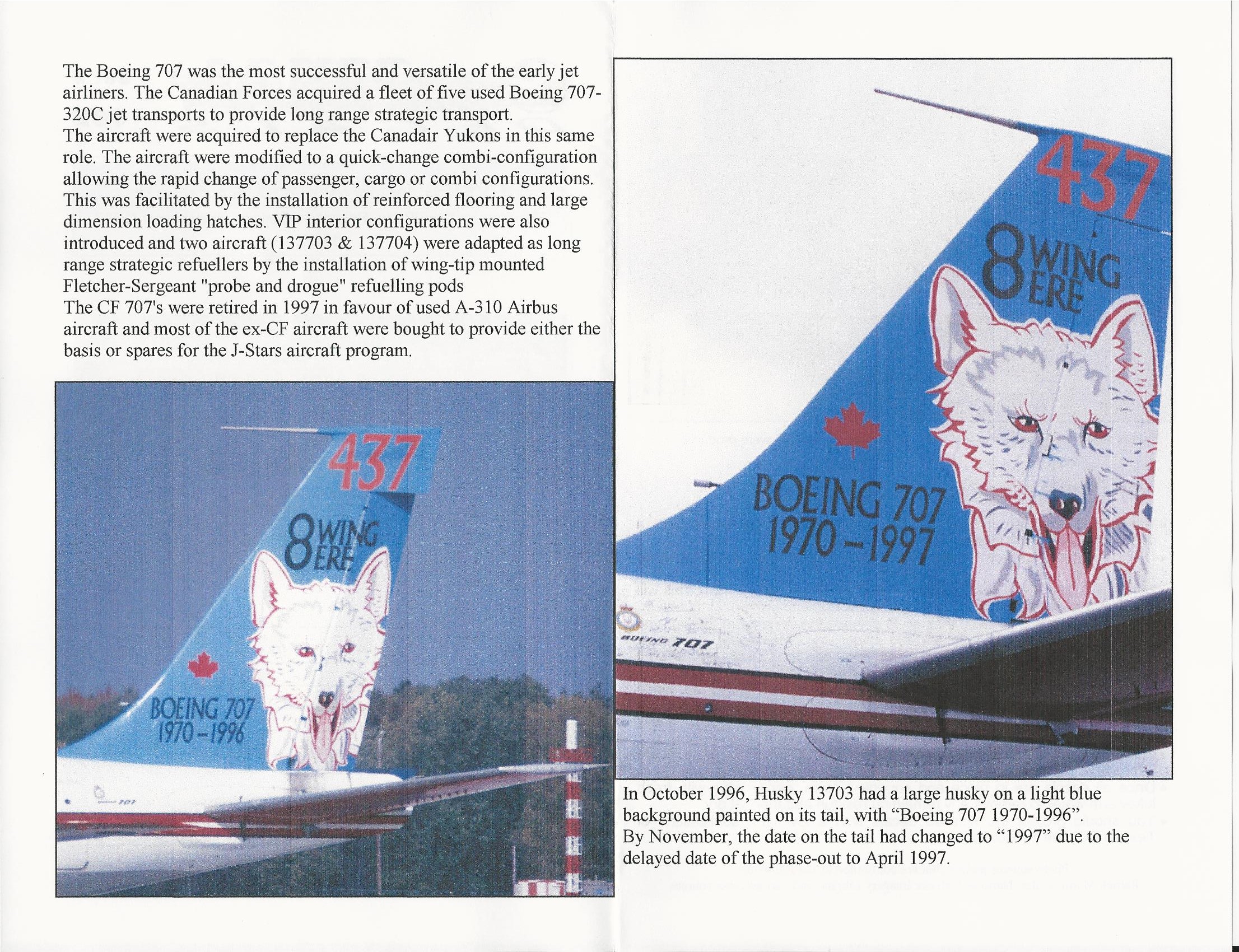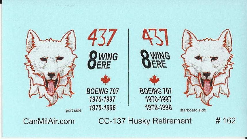 This sheet includes the markings for the Boeing 707 13703 that it wore for it's retirement. It includes the tail art as well as two date blocks, as it was changed part way through its use.