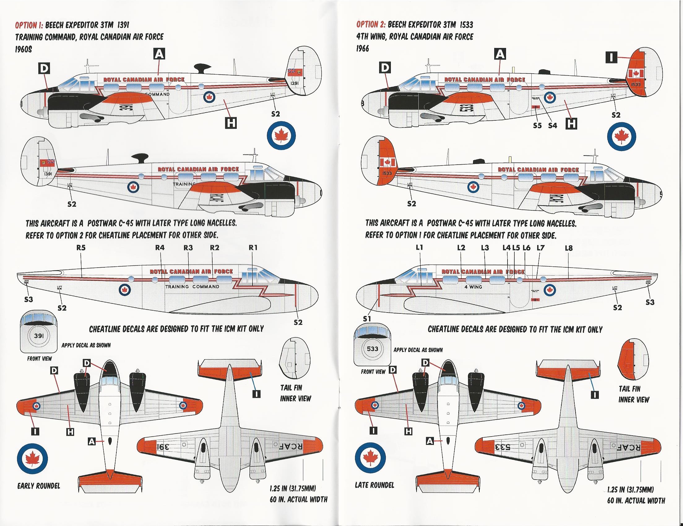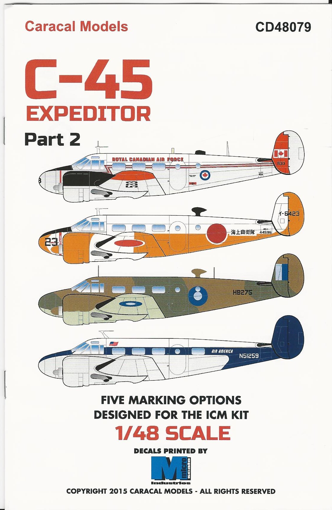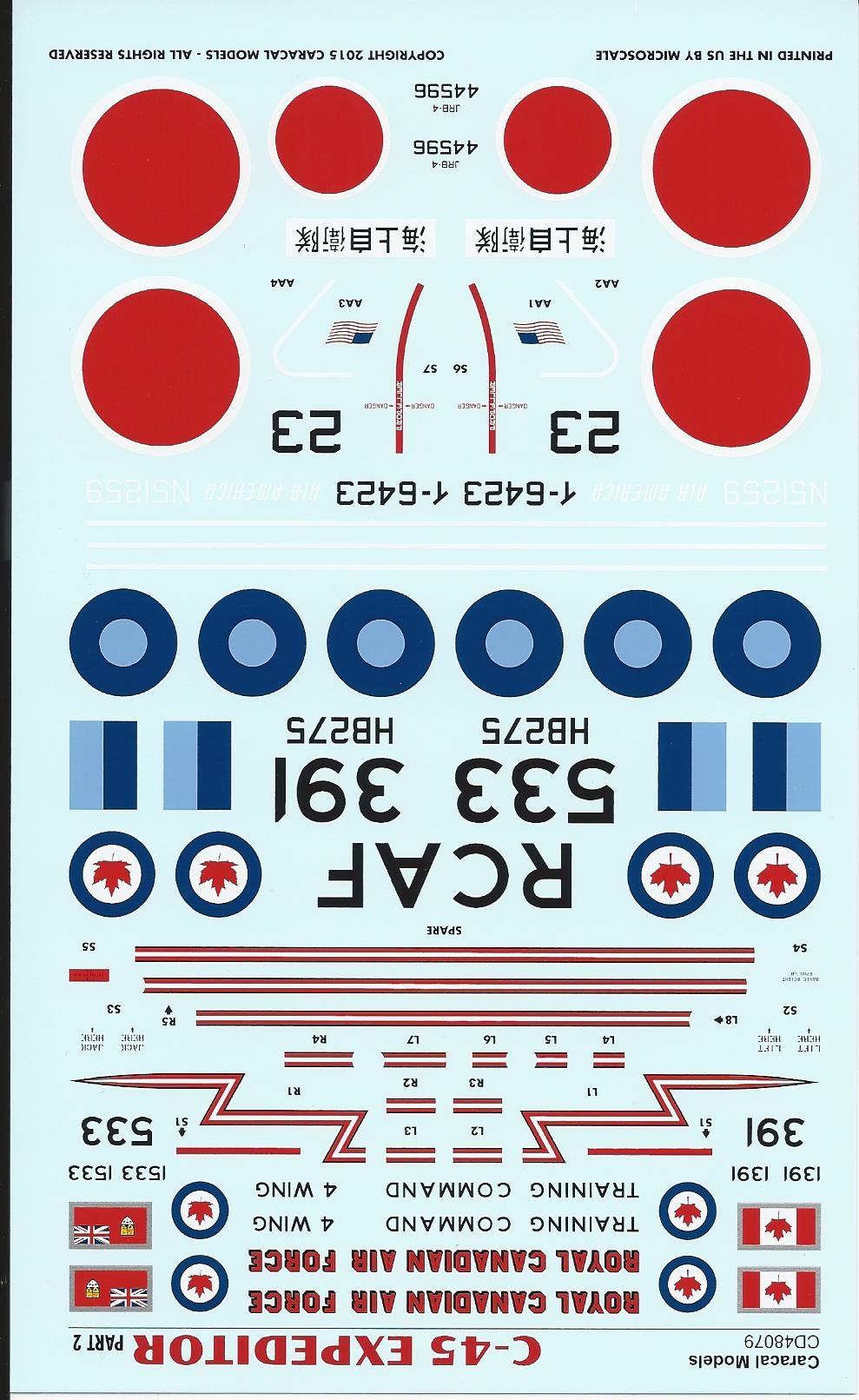 This is one of Caracal's Beech Expeditor decal sheets. It has options for 5 aircraft from 4 different countries . There are enough decals to make every option on the sheet.