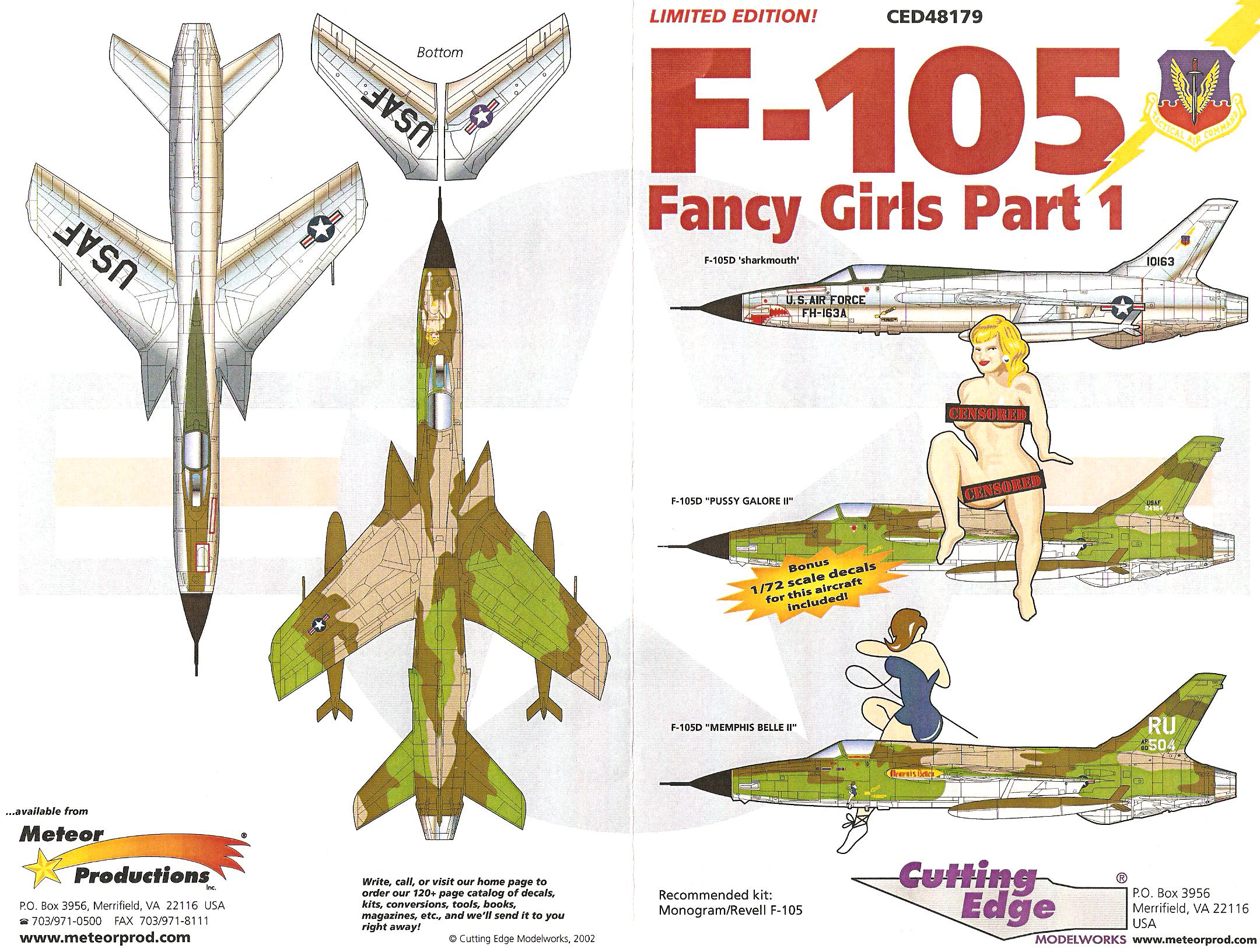 This is one of the most sought after decal sets for the F-105. The nose of one features a nude woman in a very un-flatering pose, right over top of the in-air refueling door. The