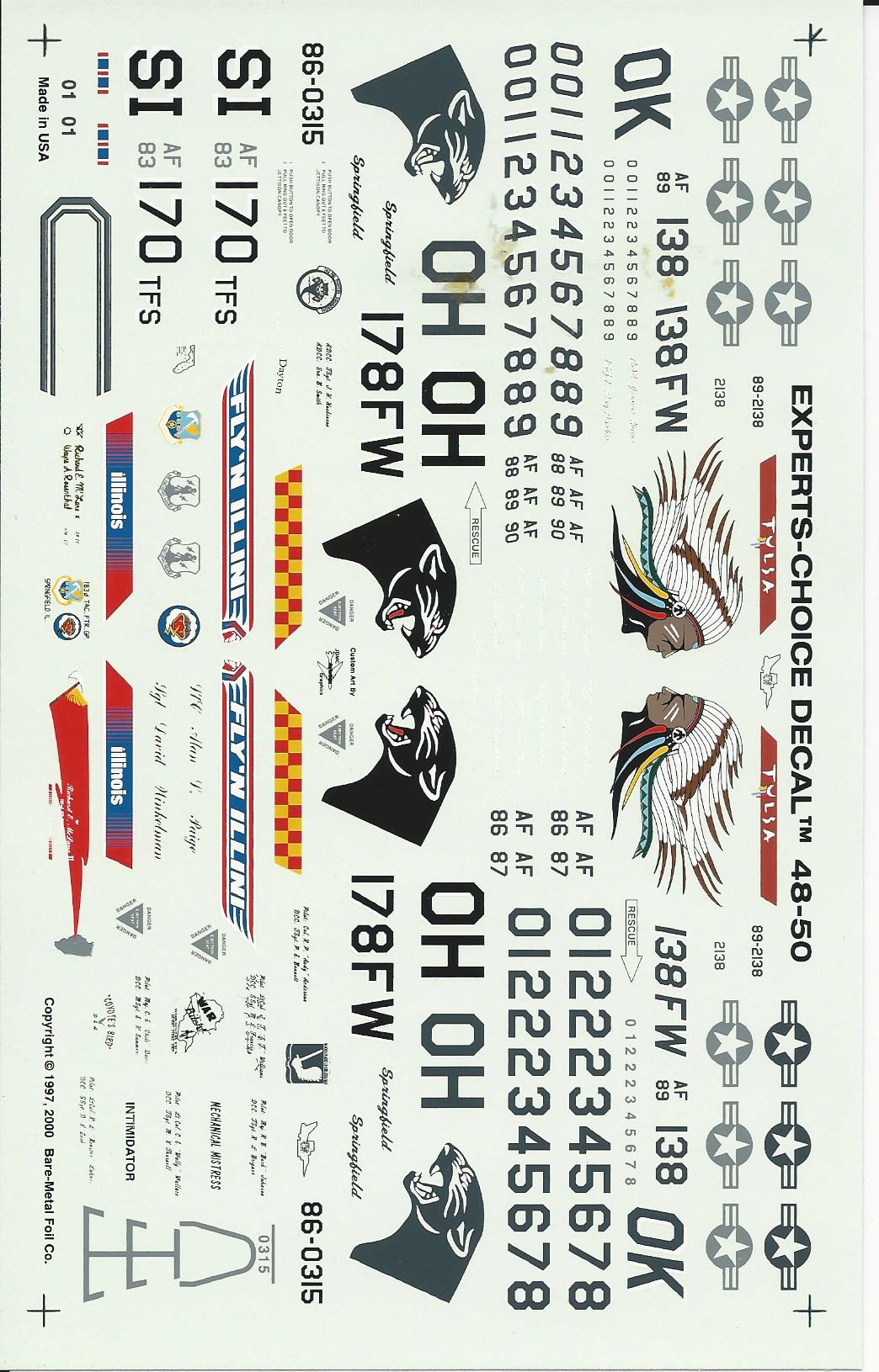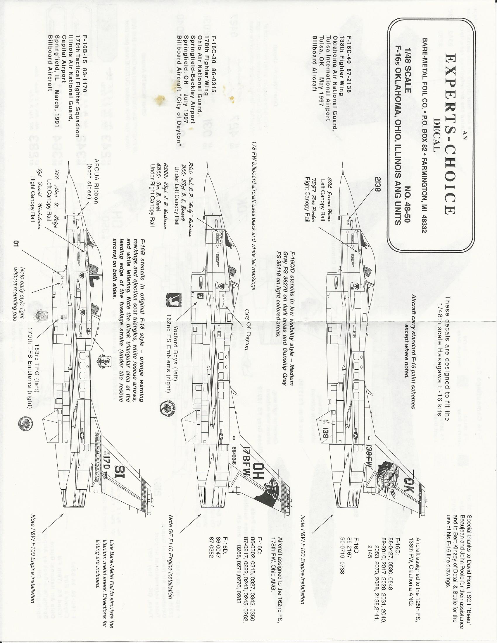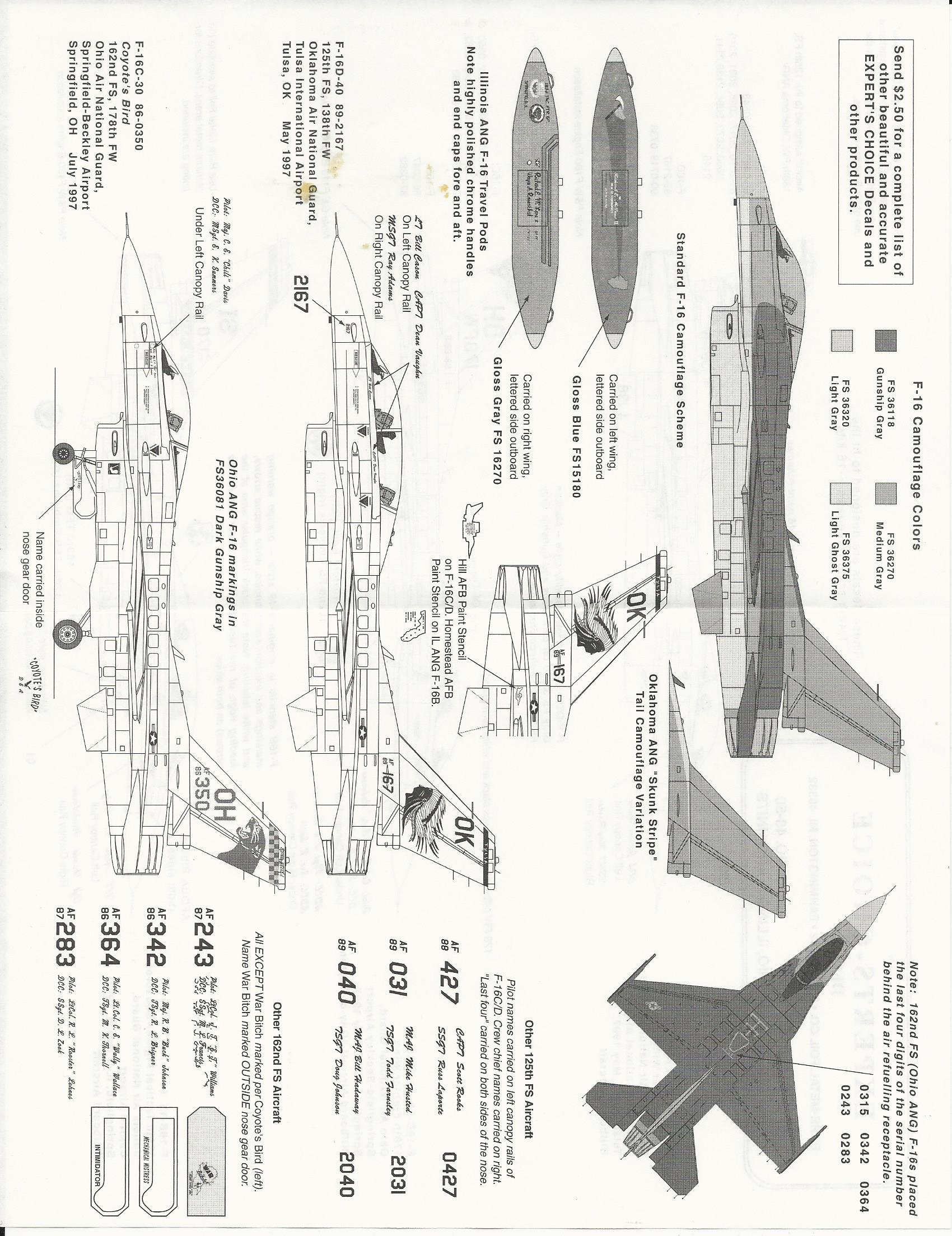 This sheet is a wonderful sheet for a 1-48th F-16.There are 12 different aircraft offered on this sheet., however, there are spare numbers and lists to allow you to build any aircraft flown by these units.