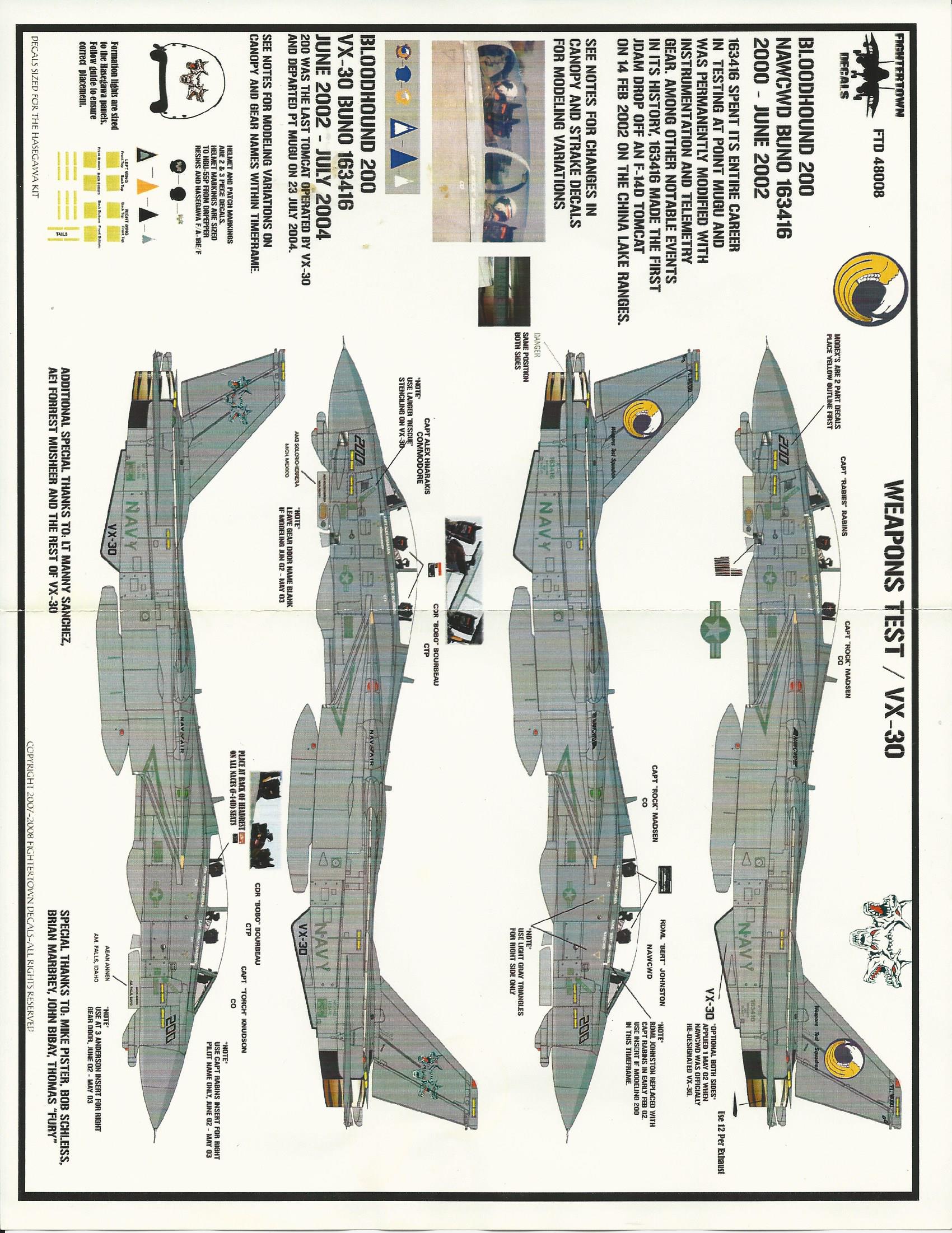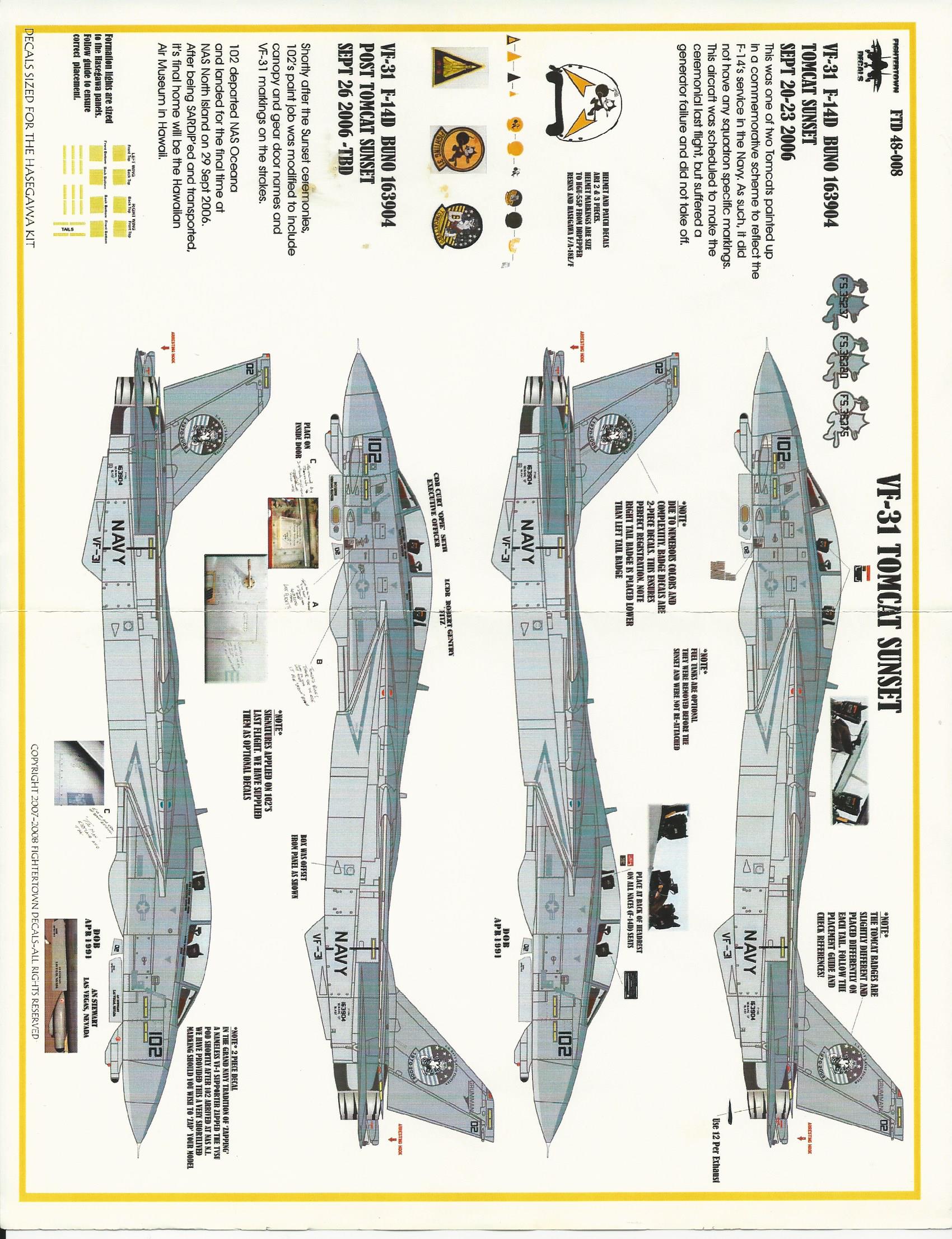 This is one of Fighter Town's F-14 sheets and inlcudes markings for VX-30 weapons test unit and VF-31 retirment scheme.