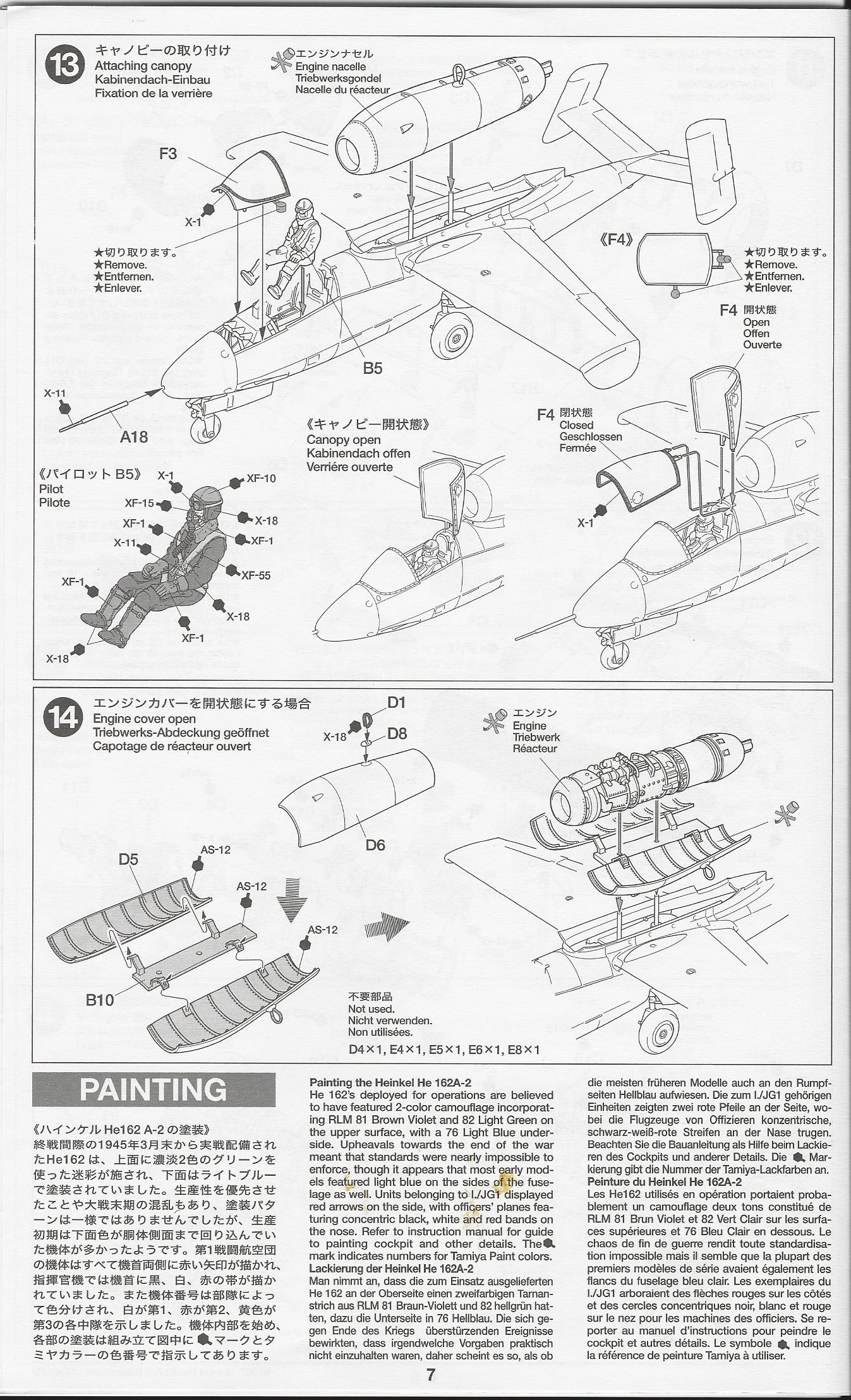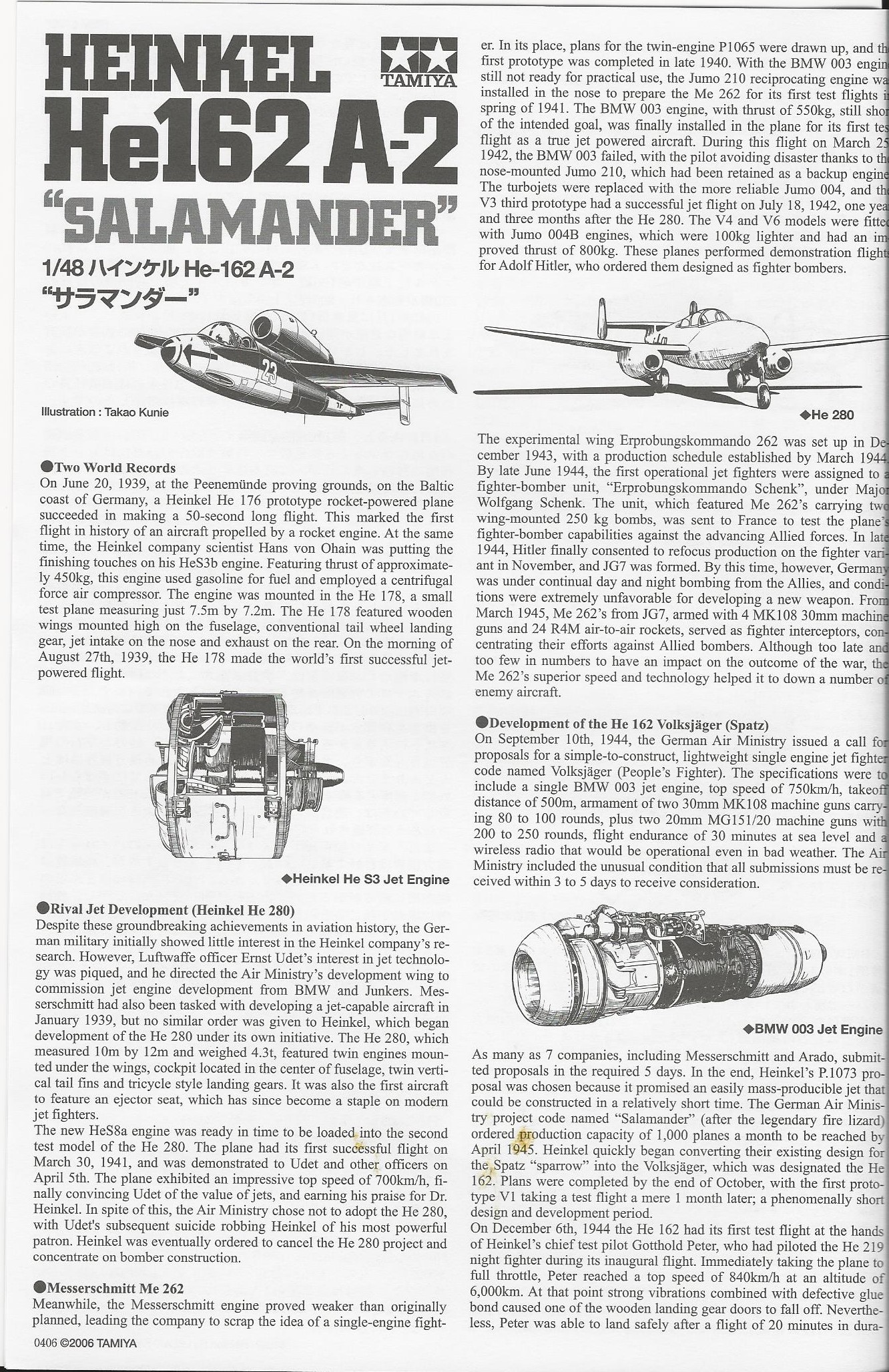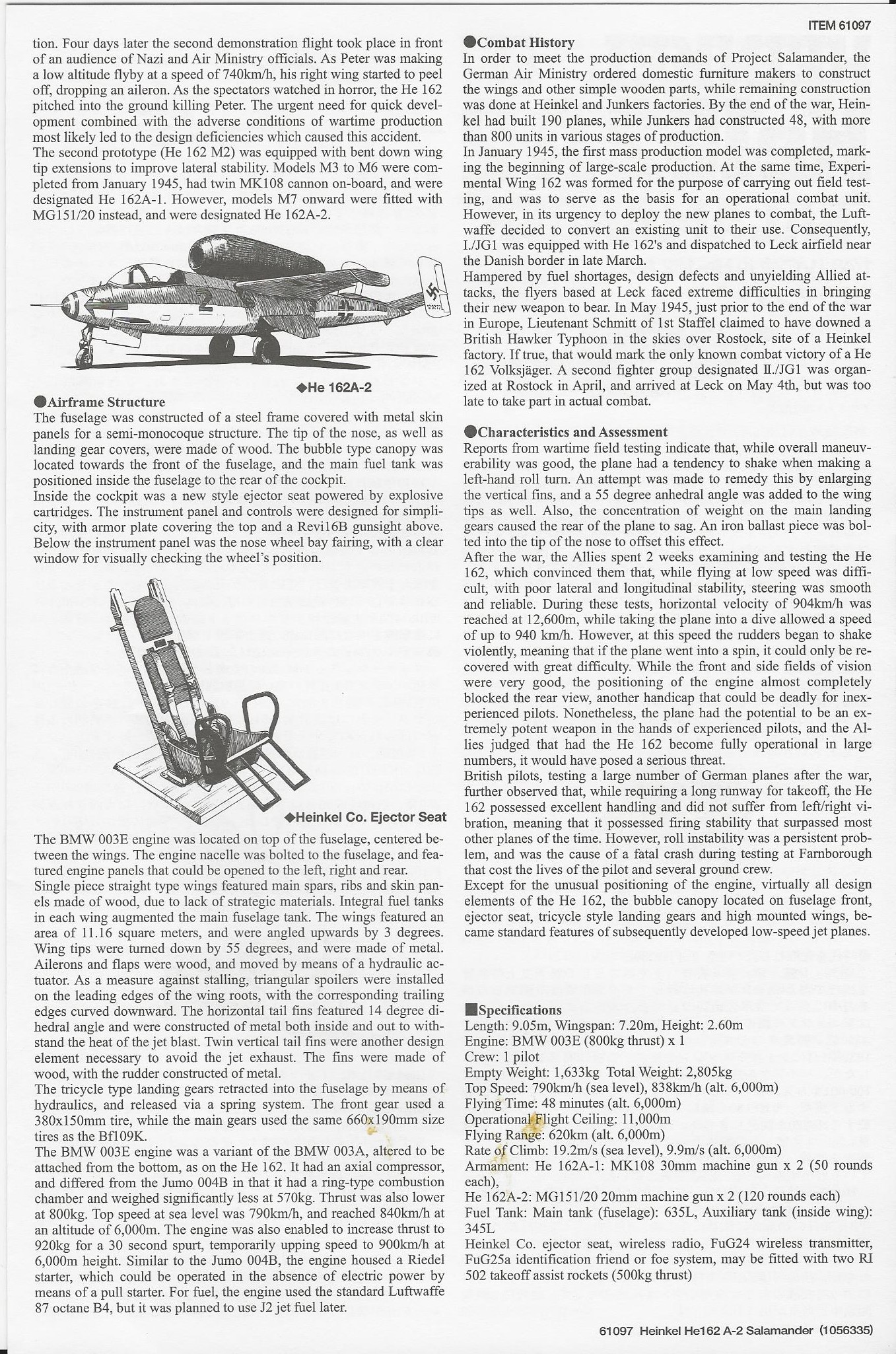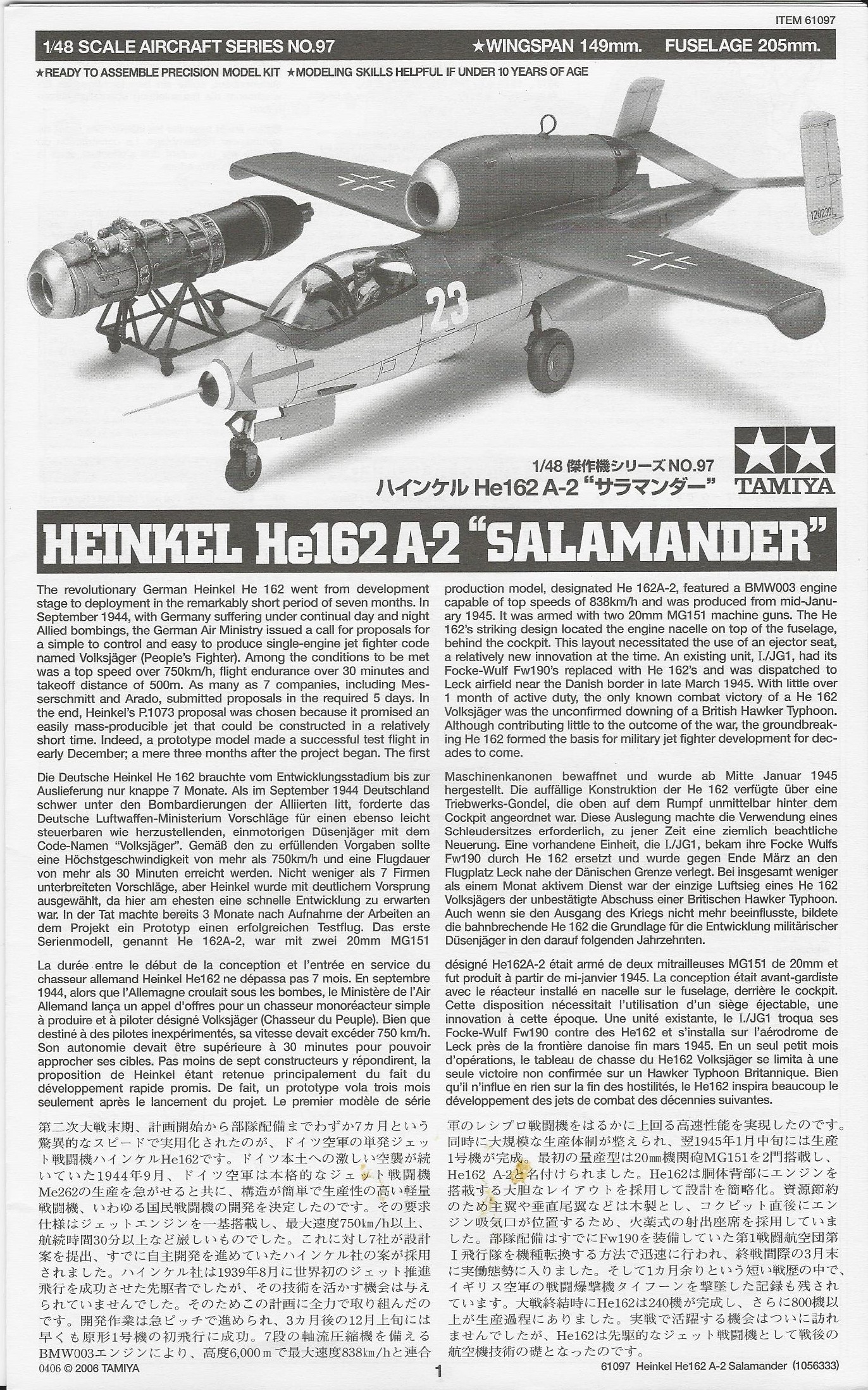 This model is the typical Tamiya offering. Lots of detail, great fit and a very accurate looking He-162. The kit includes a detailed engine with open cowl as well as a closed cowl engine,