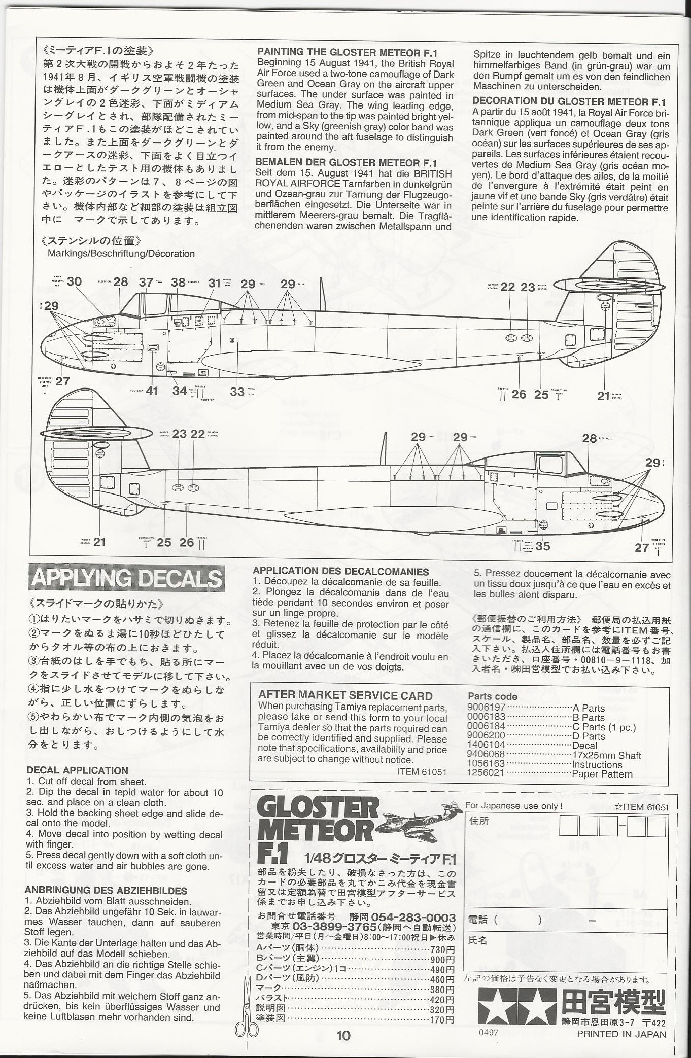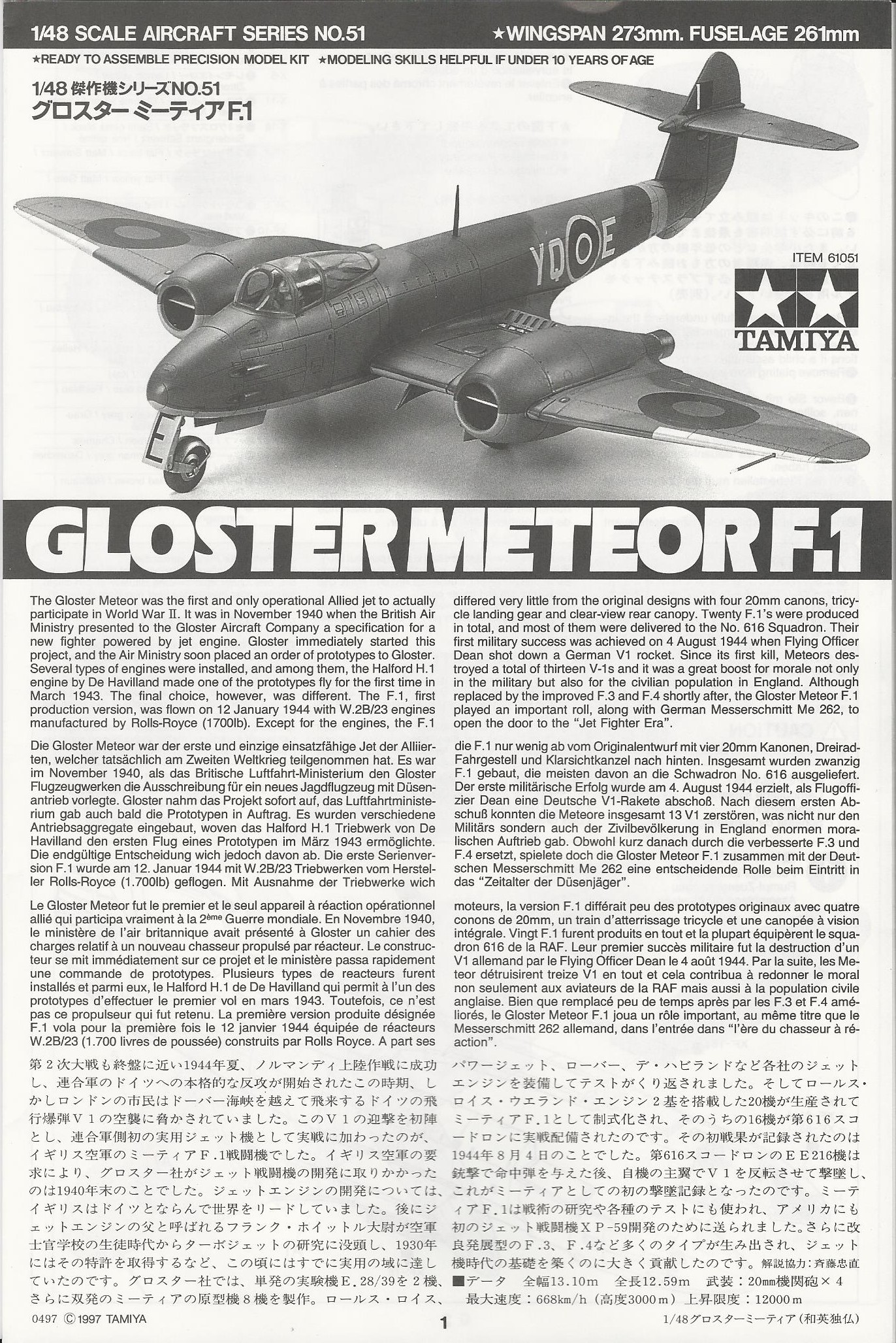 This model is the typical Tamiya offering. Lots of detail, great fit and a very accurate looking Meteor. It includes a detailed cockpit, posable dive flaps,