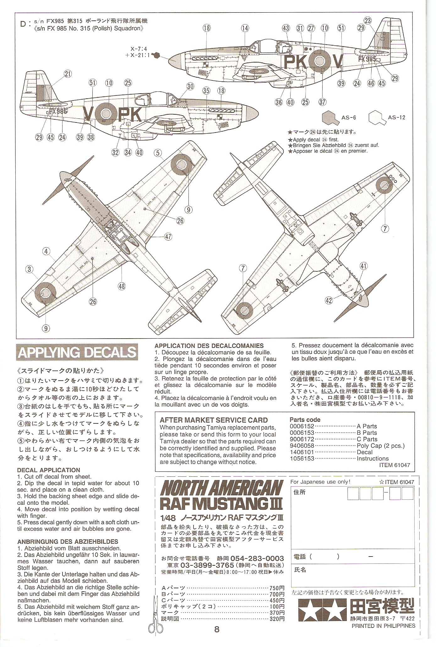 This model is the typical Tamiya offering. Lots of detail, great fit and a very accurate looking P-51.Included are 500lbs bombs and the choice between