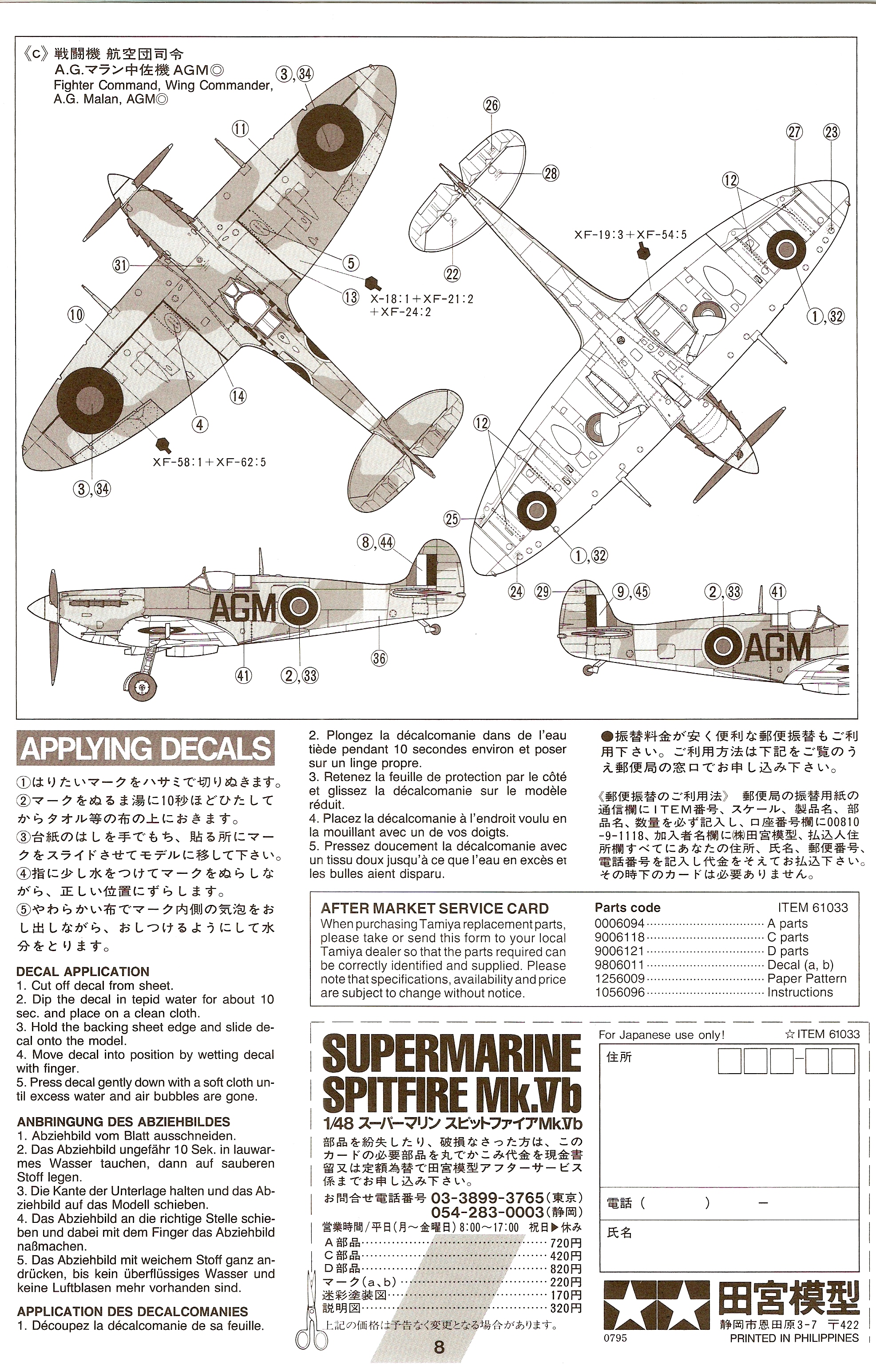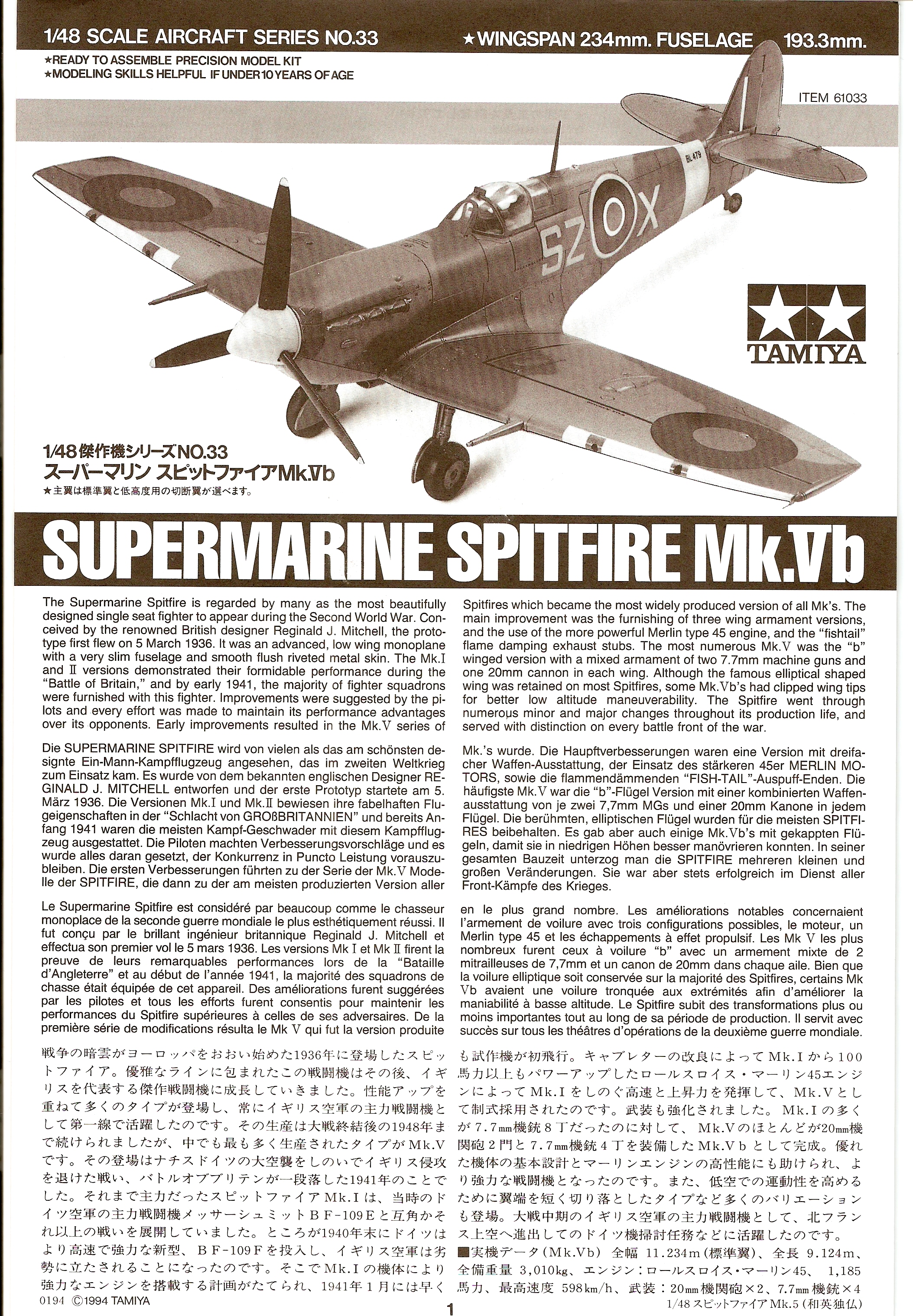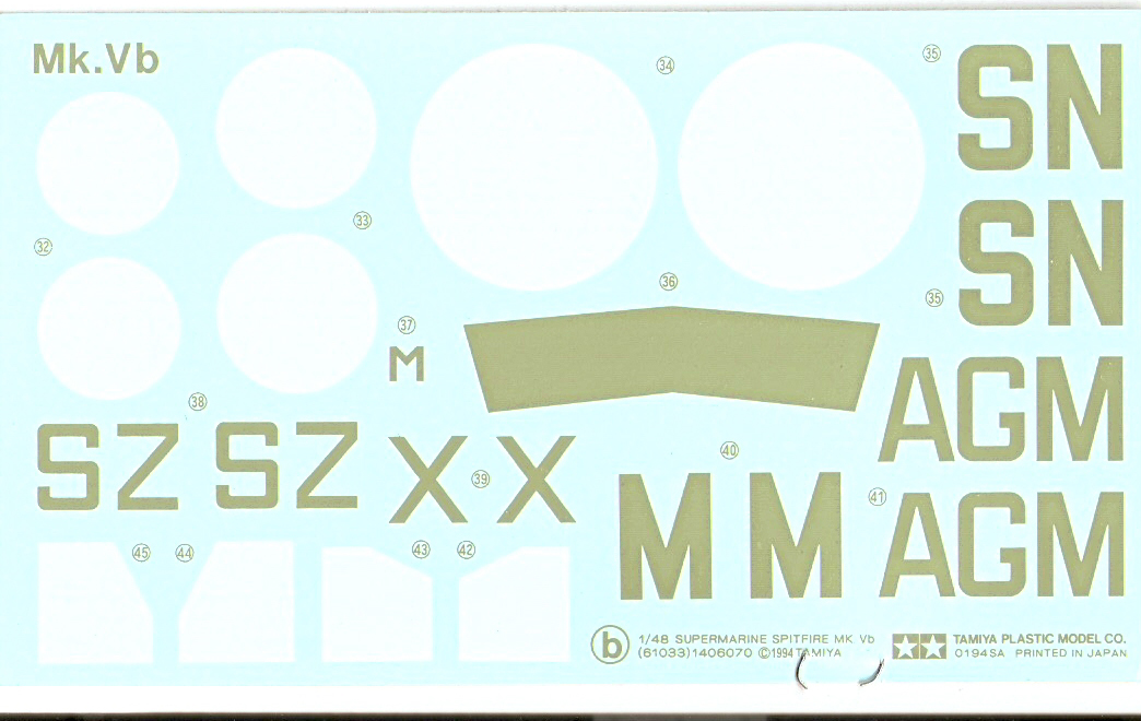 :This model is the typical Tamiya offering. Lots of detail, great fit and a very accurate looking Spitfire. It comes with two types of windscreens: armoured and un-armoured,