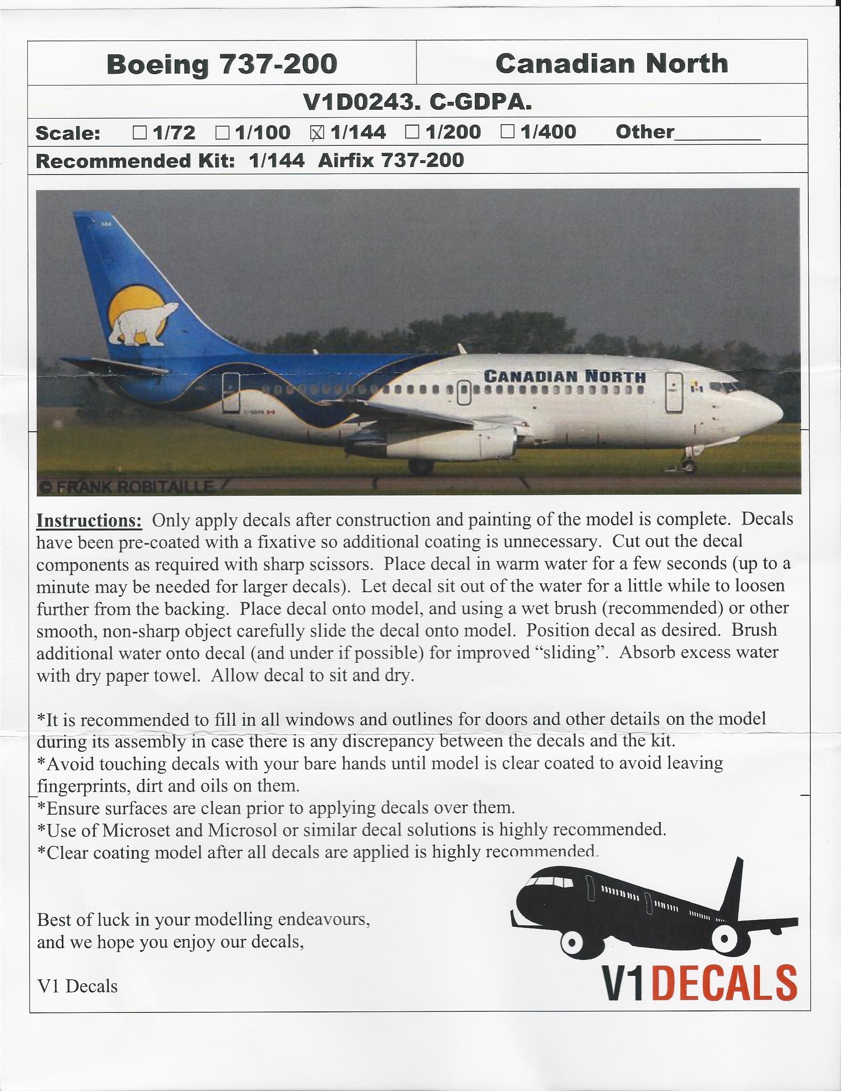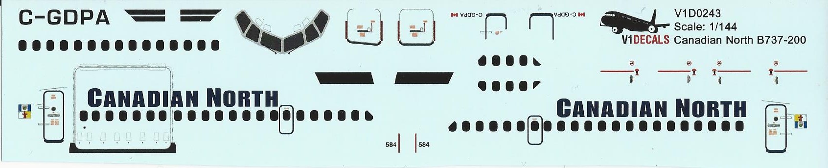 This is the only available decal set for the Canadian North 737-200. It is beautifully printed on both clear and white decal paper. You get three sets of tail markings in case you mess one set up.